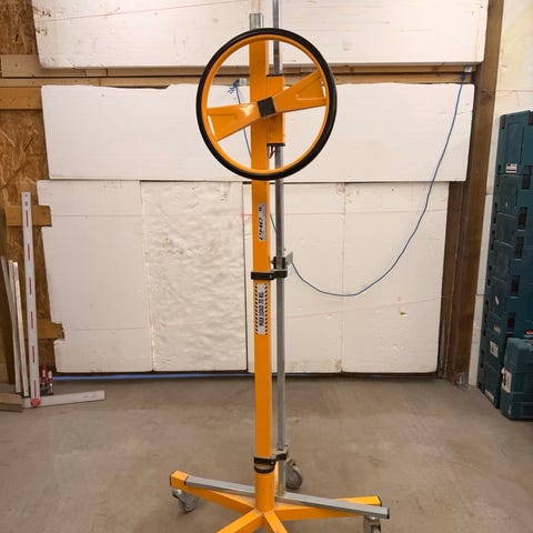 Skivhiss från CMC med maxlast 70 kg och justerbar lyfthöjd 1700–3200 mm. Lyftarmen är monterad på ett teleskoprör med rattstyrd kedjehiss och stativet har fem hjul för mobilitet.