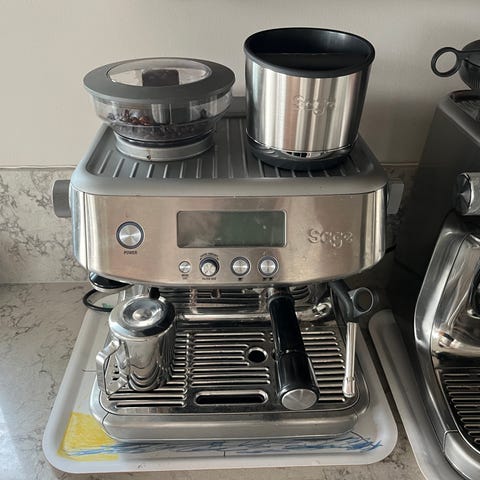 Glassmaskin från Sage, modellen The Smart Scoop i rostfritt stål med digital display och flera knappar för inställningar. Stor löstagbar behållare och genomskinligt lock upptill för enkel påfyllning.