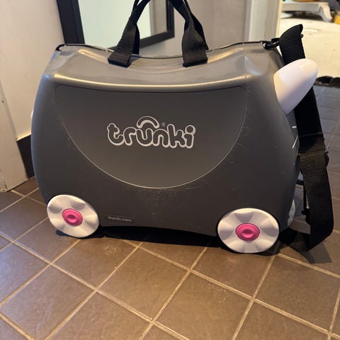 Orange Trunki resväska i tigerdesign för barn. Har dragrem, bärrem och hjul så barnet kan sitta och åka på väskan.