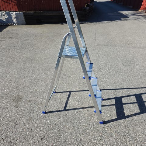 Stege i aluminium utformad som hushållsstege med flera breda steg. Passar för arbete inomhus, exempelvis vid målning, rengöring eller när man behöver nå högre hyllor. Hopfällbar konstruktion som underlättar förvaring i förråd, garage eller liknande utrymmen.