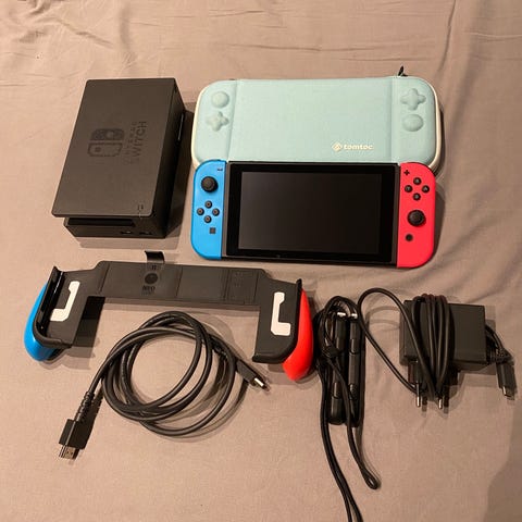 Nintendo Switch spelkonsol med vit docka och joy-cons. Följer med allt som kom vid köp, men även två spel och ett skyddande fodral från Nintendo. Spelen som medföljer är: Kirby and the forgotten land, samt Animal Crossing: New Horizon.