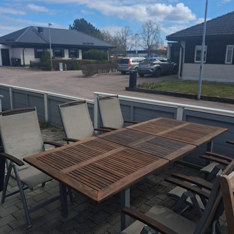 Säljer ett fint omhändertaget matbord med 6 positionsstolar i teak med tillhörande 6 svarta dynor.