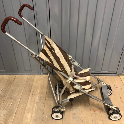 Mclaren paraplyvagn med svart sits och blommigt mönstrat tyg. Sitsen går att fälla ner om barnet ska sova. Har varukorg under, dubbelhjul och går lätt att fälla ihop till en smal vagn.
