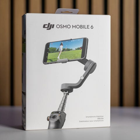 DJI Osmo gimbal för mobil i grå färg, hopfällbar med handledsrem. Har magnetfäste för telefonen och enkel knapp på sidan för styrning.