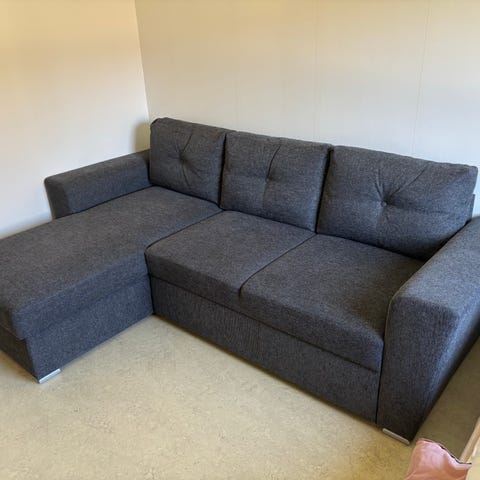 Mått: 240 cm bred × 156 cm djup. Divan på höger sida. Bädd ca 200 × 140 cm för 2 pers.