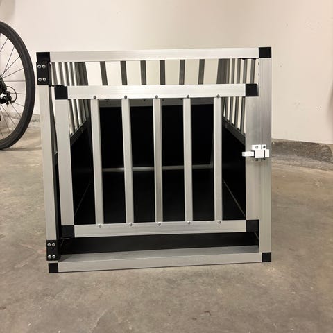 Stadig hundbur i metallgaller med öppning upptill. Passar bra att ställa ute på gården eller vid hundgård. Stor skuff kan man ha i bilen också