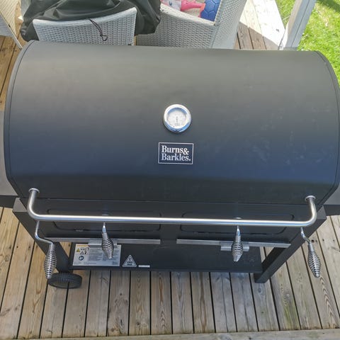 Enders gasolgrill med tre reglage och stor grillyta. Har lock med termometer, sidobord och hjul så den är lätt att flytta på altanen.