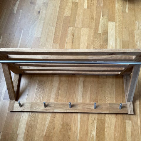 Klassisk hatthylla med 4 dubbelkrokar och 1 hyllplan. Mått (BDH) 100 X 31 X 21 cm. Lite sliten men hel och fullt fungerande.