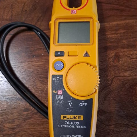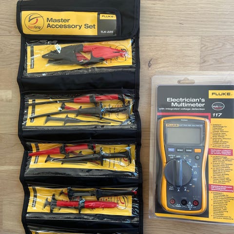 Fluke 117 multimeter med integrerad spänningsdetektering. Har stort vred på framsidan och tydliga mätkablar med spetsprober.
