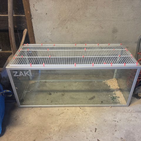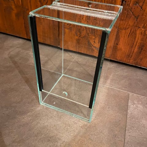Litet akvarium med lock och lysrör. Har gjort lufthål i locket då det använts till att ha spindel i tidigare men funkar som akvarium också.