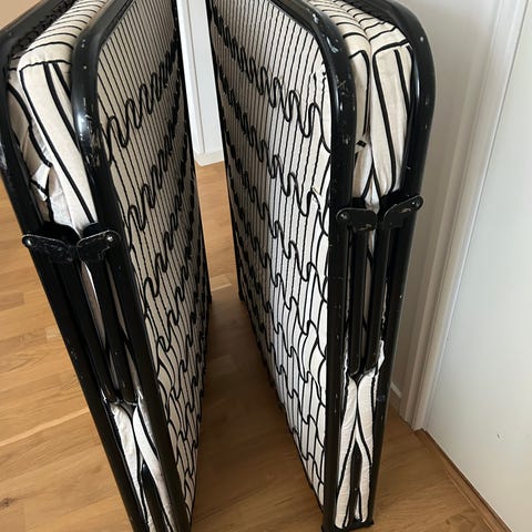 Fällbar säng från Jysk med ribbotten och hjul under stommen. Madrass med randigt överdrag ingår på bädden.