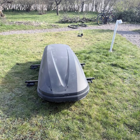 Takbox från Autoform i silver som sitter på takräcke. Smidig modell som öppnas från sidan och har flera fästpunkter mot räcket.