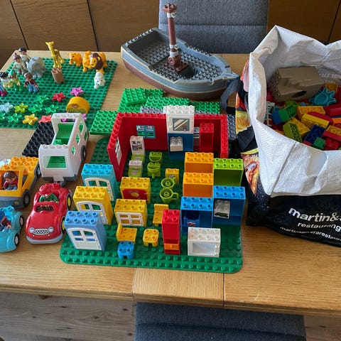 Stor påse LEGO DUPLO med blandade klossar, djur, figurer och fordon. Följer med olika färger och former samt en manual för huset. (Ej garanti på att alla bitar till det finns med!)