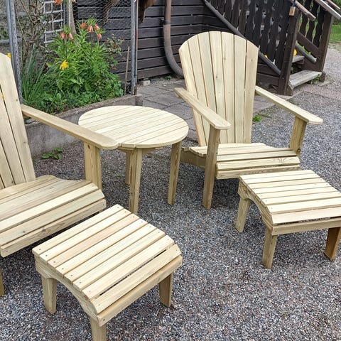 Köpt i höstas men passade inte in i nya huset, medföljer en extra stol som den ena benet råkat knäckas. Lätt för den händige att ersätta med ny