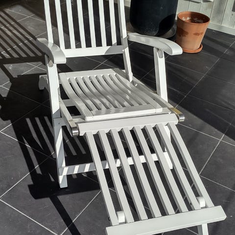 Bekväm solstol i trä med ribbor och rep som håller ihop sitsen. Har lutande rygg och nackkudde som gör den skön att sitta i på altanen eller balkongen.