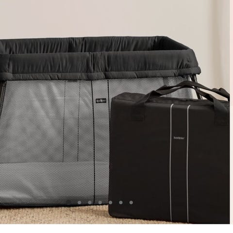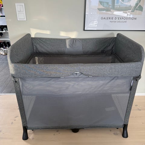Resesäng från Babybjörn i ljusgrått tyg med svarta nätpaneler på sidorna. Stabil ram med svarta ben och madrass som ligger plant i botten.