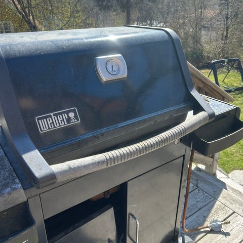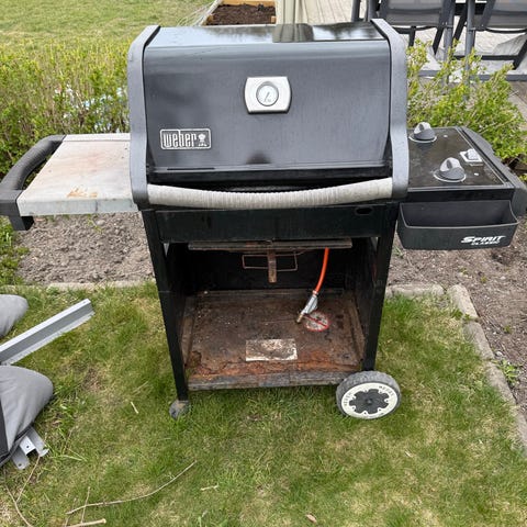 En Weber Spirit Classic som är inköpt för 20 år sen. Helt fungerande men synliga slitage finns att se i bilderna. Med rätt kunskap hos köparen går det säkert att lägga på en ny legering inuti grillkopan och putsa upp den utomvändigt.