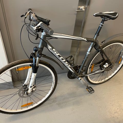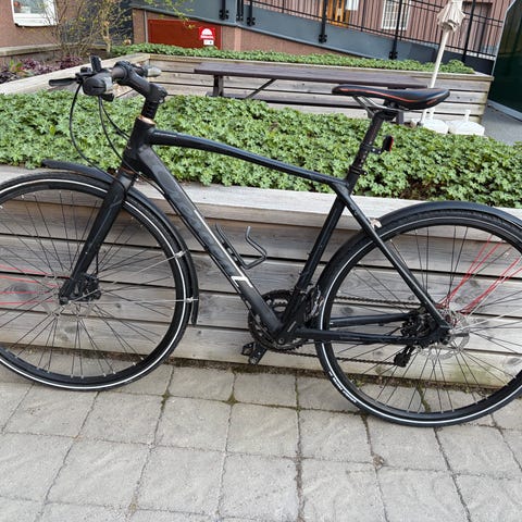 Moddad hybridcykel ombyggd till singelspeed. 59 cm eller strl L. Bakdäck lite slitet men fullt fungerande med Gatorskins.
