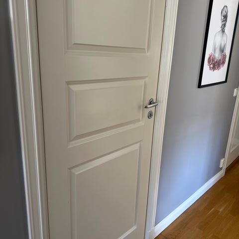 5 släta vita innerdörrar, 4 st 204x825 cm, 1 st 204x725 cm. Gott skick dock finns ett litet hål efter nubb på en av de breda dörrarna. Lås och trycke ingår inte. Säljs också styckvis, 50 kr styck.