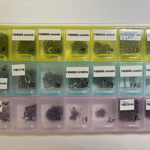 Blandning av fiskekrokar i olika storlekar sorterade i små askar och plastlådor. Flera fack är märkta med storlekar och krokarna ligger buntade i varje fack. Är nog 1000 stycken