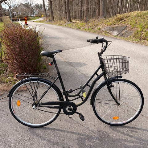Köpt ny på Jula i Linköping 2023-04, kvitto finns. 3 växlar, handbroms och fotbroms. Har knappt cyklats på. Jag monterade en bättre sadel som är höj-sänkbar när den var ny, och handttagen har bytts ut.