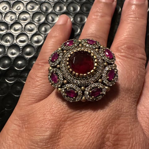 Ring från & Other Stories i silver med mörkblå safirsten i mitten. Dekorerad med flera små stenar runt om i ett blomliknande mönster.