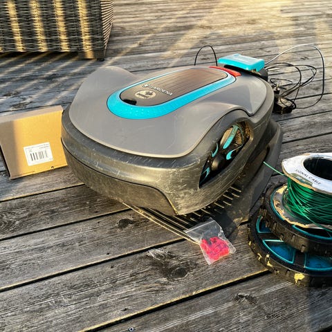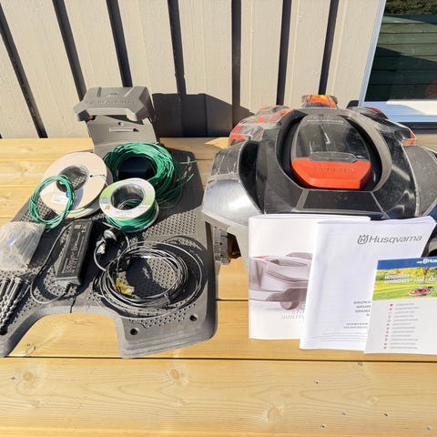 Worx WG791E robotgräsklippare 28V med display och knappsats på ovansidan. Med följer begränsningskabel och tillbehör för installation i trädgården.