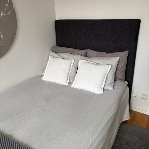 Sänggavel från Sängfabriken i grått tyg med knappar. Passar till 180 cm säng och ger ett ombonat intryck bakom sängen.