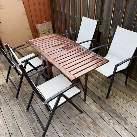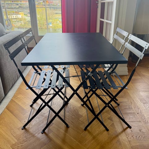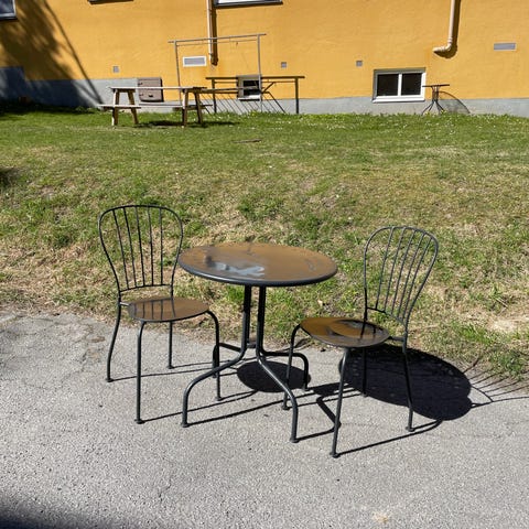 Bord med två matchande fällstolar, passar bra på balkong eller uteplats. Bordet har enkel metallstomme och slät bordsskiva i samma färg som stolarna. Från danska house doctor.