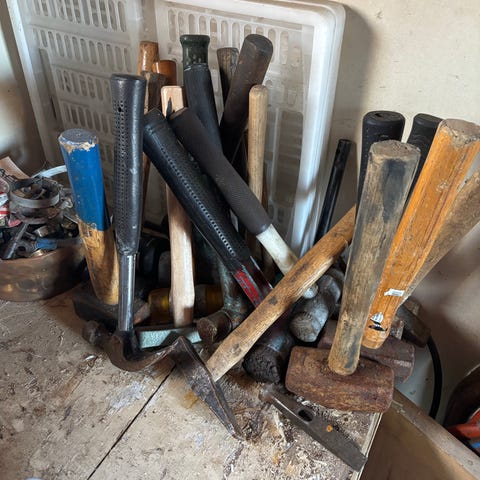 Säljer ett gäng blandade handverktyg med flera olika hammare, skruvmejslar och tänger. Några har trähandtag och några har plastgrepp, bra som extra uppsättning i verkstaden.