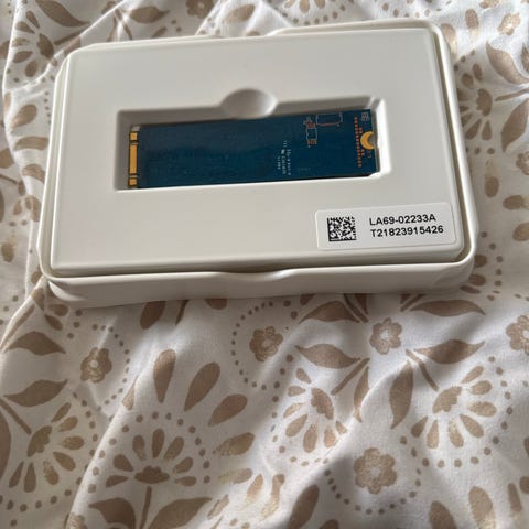 SK Hynix M.2 NVMe SSD på 256GB, modell HFS256GD9TNG. Smidig liten disk att stoppa i datorn, sitter på grön krets med etikett ovanpå.