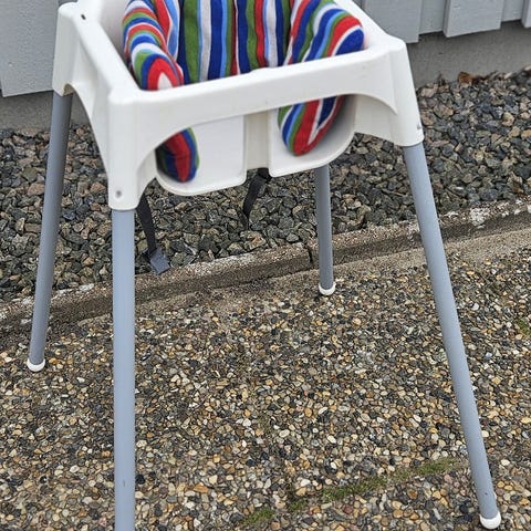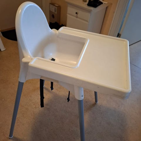 Barnmatstol från IKEA med stor bricka och bälte i sätet