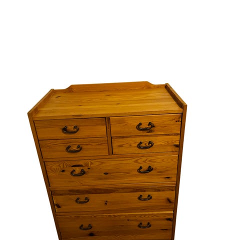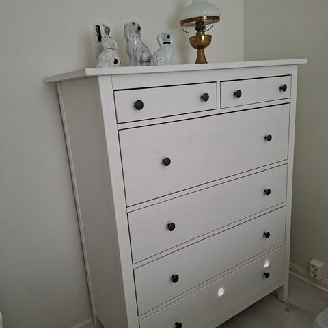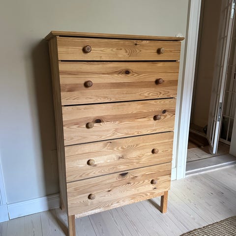 Fin IKEA byrå i massiv furu med sex lådor i olika storlekar. Runda knoppar på alla lådor.
