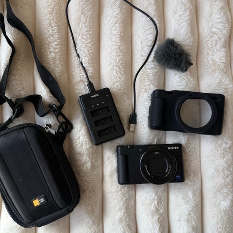 Flera svarta kameraväskor och hårda fodral från Sony och andra märken. Olika storlekar med axelremmar, dragkedjor och små fickor för kamera och tillbehör.