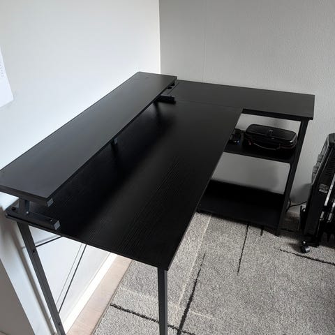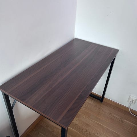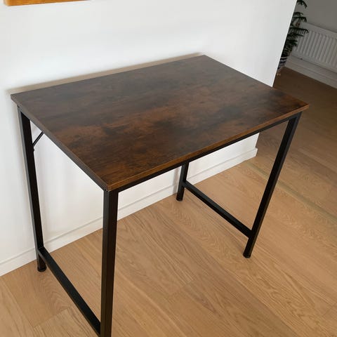 Skrivbord från IKEA vet ej vem som har designat av hörnmodell med träfärgad skiva. Stadigt underrede i mörk metall som ger gott om plats för dator och arbete.