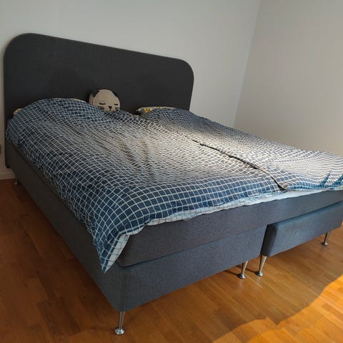 Kontinentalsäng 180x200 i grått tyg med matchande sänggavel. Mjuk bäddmadrass och stoppad gavel med lösa kuddar som sitter fast upptill.