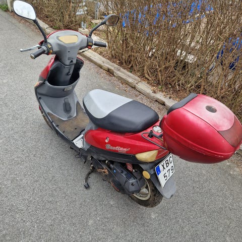 Peugeot Speedfight scooter eller viva sport Eu moped från 2006 säljes nya däck lite bytta plast delar sparsamt körd dom sista 10 åren men fungerar bra. Batteriet behöver nog bytas ? Och upptäck att bakdäckets ventil har spruckit i gummit så behöver bytas fungerar men bäst att byta dragit av 1500 pga detta så tycker 7000 är prutat och klart. Och tar bort annonsen så fort den är såld.