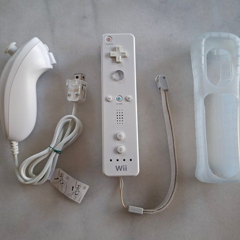Nintendo Wii Remote med handledsrem och silikonskydd + nunchuk-kontroll.