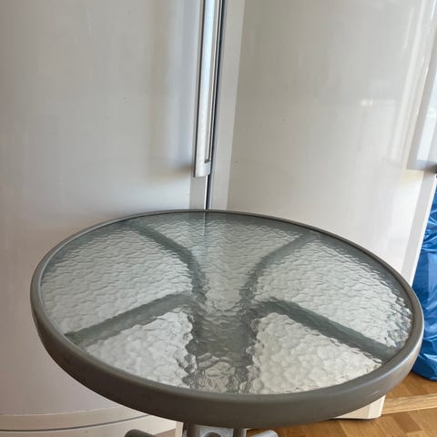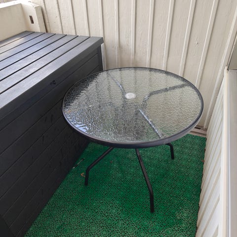 Runt glasbord med två svarta stolar och beige dyna till uteplats
