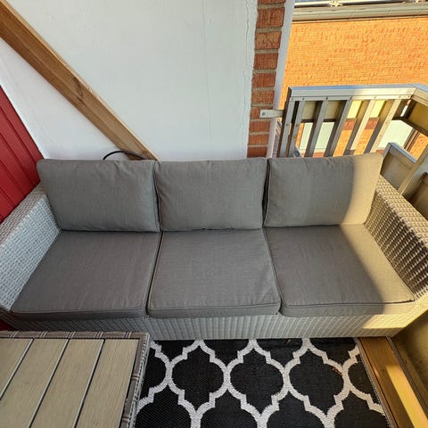 En furusoffa med ställbar säte . Hög rygg . Ca 160 cn lång. Har stått i uterum.