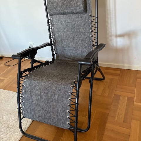 Svart hopfällbar solstol med armstöd och justerbar rygg. Har snörad sits och rygg samt avtagbar nackkudde.