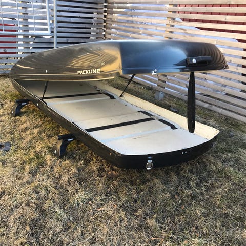 Packline takbox i bruksskick. Skrapmärken på ovansidan. Låses med hänglås då orginalnycklar ej finns. Annars fungerar allt. Fästen passat till takräck eller rails som är max 35mm breda och 21 mm tjocka.