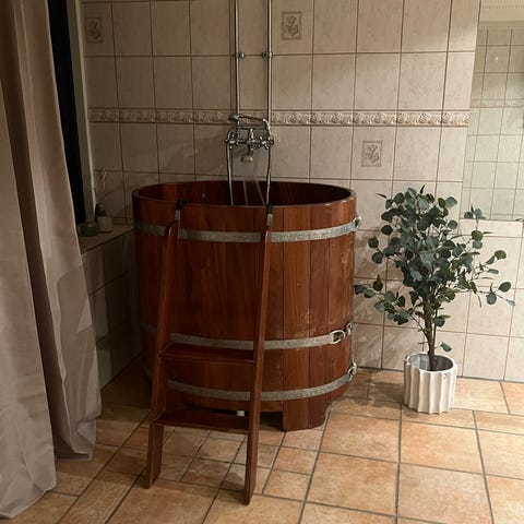 Kromad badkarsblandare med två vred för varmt och kallt vatten samt pip för badkar. Med flexibel slang och handdusch som fästs upptill på blandaren.