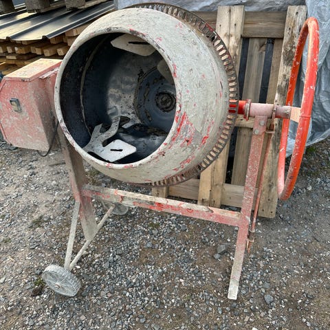 Betongblandare i orange färg manuell ratt för att snurra den. Står på ben med två små hjul bak så den går att rulla runt på gården eller bygget.