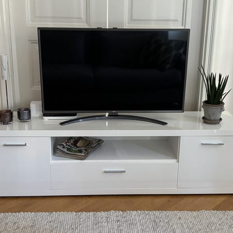 Vit tv-bänk från Mio designad av Alberto Meda. Har glasdörrar och öppna hyllor med gott om plats för porslin eller media-prylar.