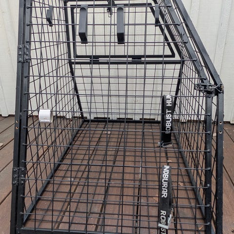 För transport och skydd av hund i bagagelucka. Snedställt bakstycke för att passa in bakom baksätet. Öppningsbar vänsterhängd dörr, hasp med låsbar ögla. Nödlucka på baksidan.