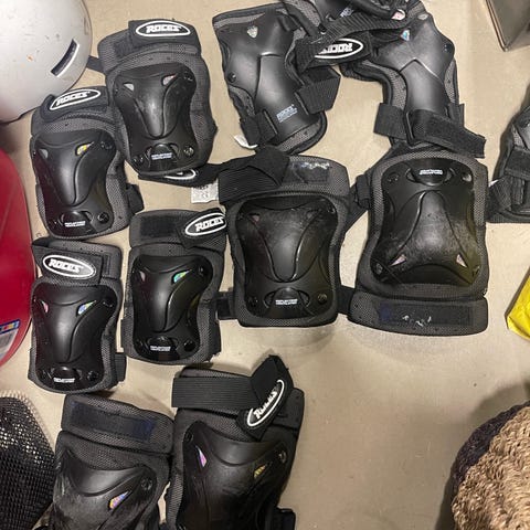 EVS skyddsjacka i svart/rött med hårda skyddsplattor fram och bak. Med följer flera delar skyddsutrustning som handskar, benskydd och nackkragar med justerbara remmar.