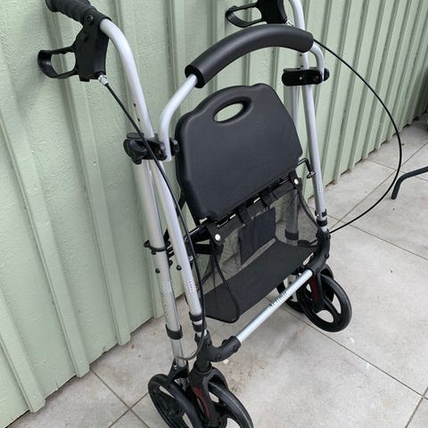 Blå rollator med korg fram och liten sits i mitten. Har handbromsar vid handtagen och fyra större hjul som rullar lätt.