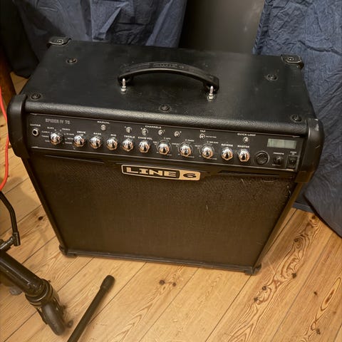 gitarrförstärkare med flera reglage på fronten för olika ljudinställningar. Har inbyggd högtalare samt uttag för hörlurar