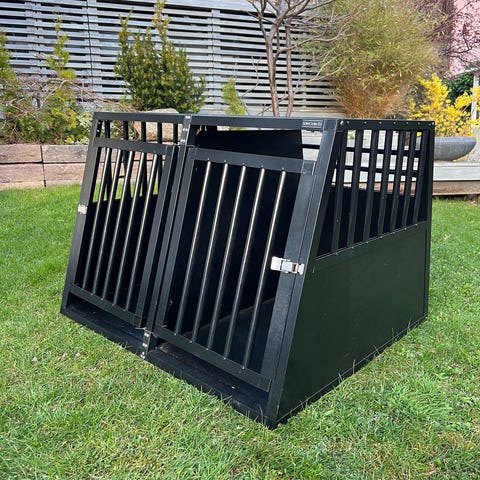 Dubbel hundbur från Alu-Flex. Hel och funkar som den ska. Har används i en Volvo xc60 -21 men passar säkert fler bilar. B:98cm H:68cm D:80cm.